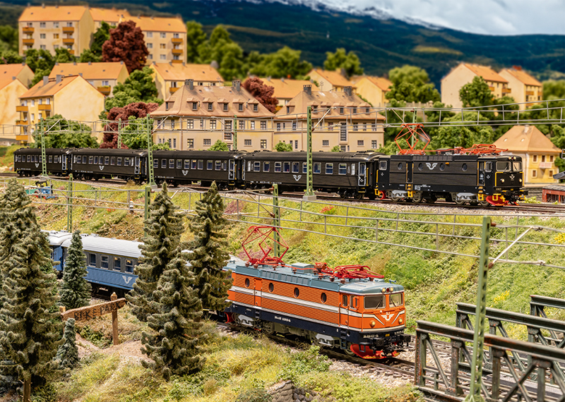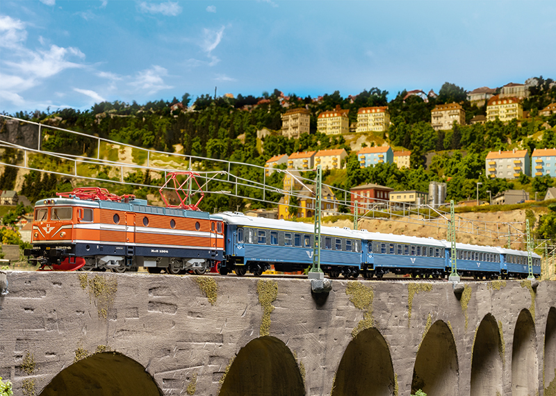 Fyra svenska statens järnvägar (SJ) personvagnar  A2, 1:a klass,  AB3K 1:a/2:a klass,  B5, 2:a klass och B1K, 2:a klass. Blå/svart
