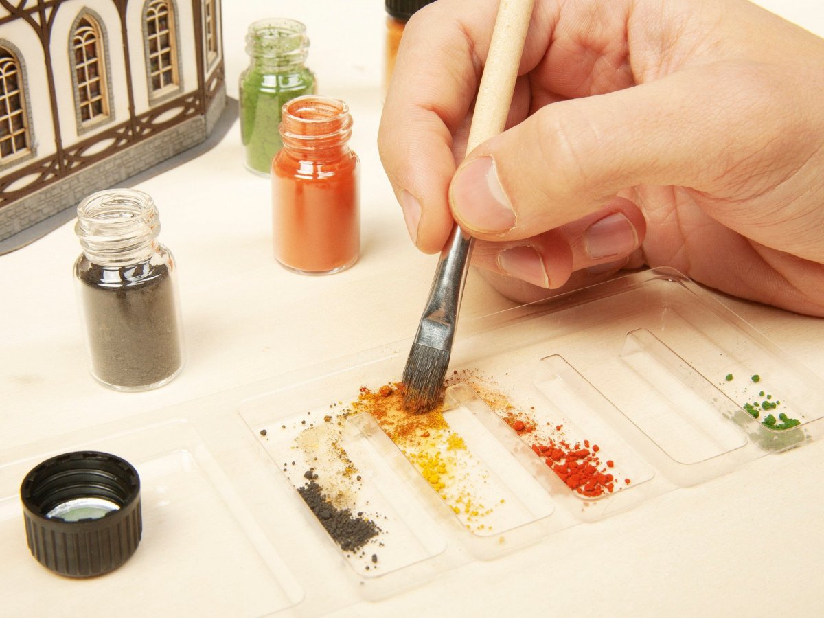 The set contains seven different colours (teal, leaf green, terracotta, russet, sand, ash and soot), with which you can age bridges, houses, vehicles, locomotives, wagons, walls, portals and much more. It is also excellent for using with aeroplane, tank or ship kits. The pigments can be mixed together until the right shade is formed. This is done professionally and very easily in the Mixing Bench’s washable Mixing Inserts.